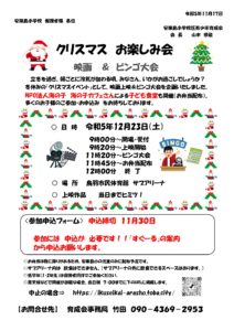 標題の通り、12/23 9:00~ 「市民体育館サブアリーナ」にて、クリスマス お楽しみ会( 映画 & ビンゴ大会 )を実施します。(^^)別途案内を、「すぐーる」にてお知らせいたしました通り、多くの方の参加をお待ちして […]